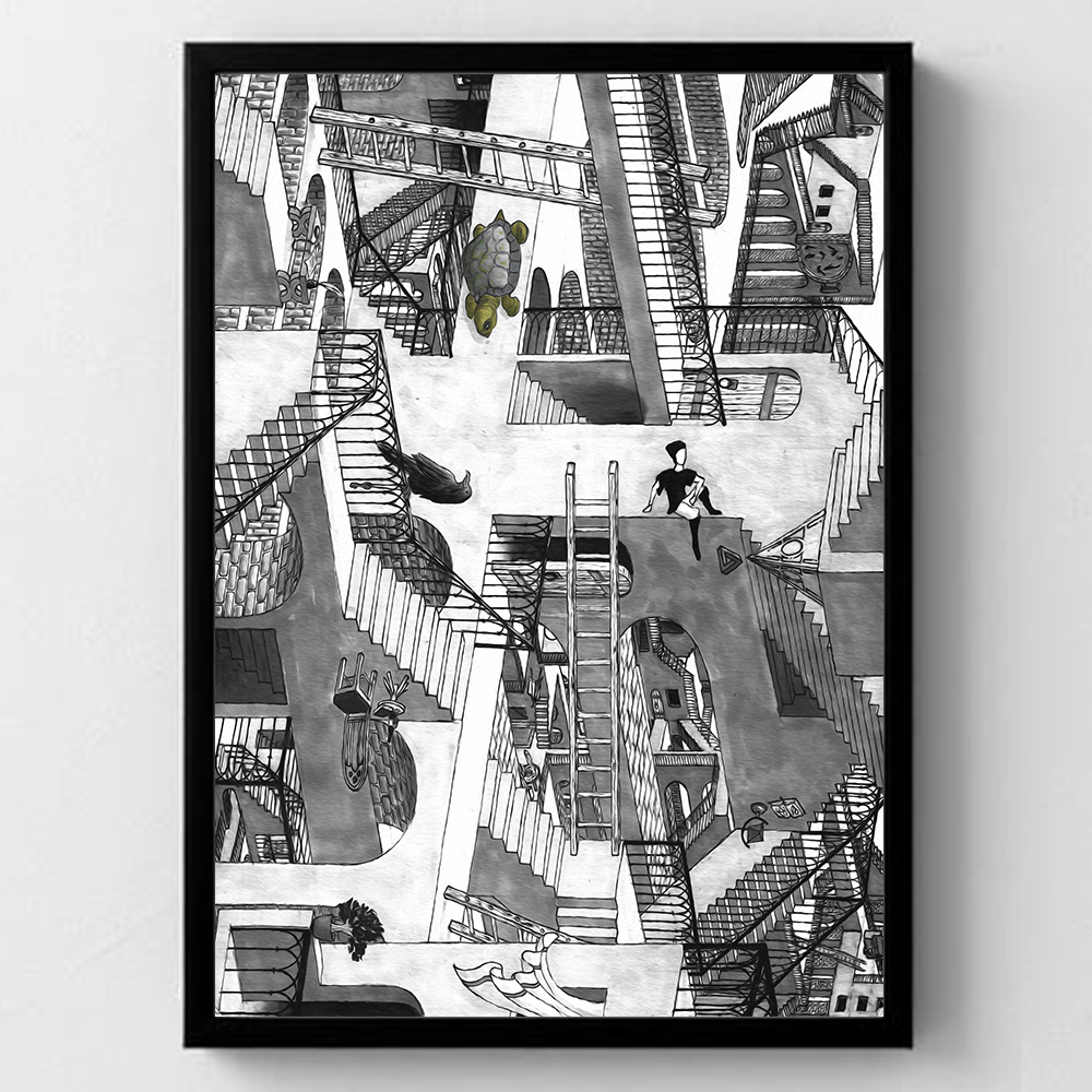 This work is an homage to M.C. Escher's 'Relativity', one of my favorite artists. I combine various perspectives into a single composition that can be viewed from multiple angles, serving as a direct visualization of the mind as a complex labyrinth. The unchanging stone stairways and structures represent the stagnation of ingrained thoughts, often the result of years of habit and the loss of mental flexibility. In contrast, the wooden ladders symbolize our capacity for growth and innovation, offering the potential to gain new insights. This is an adventurous journey inward, where you learn to accept and love the strange beauty and challenges of your inner world.