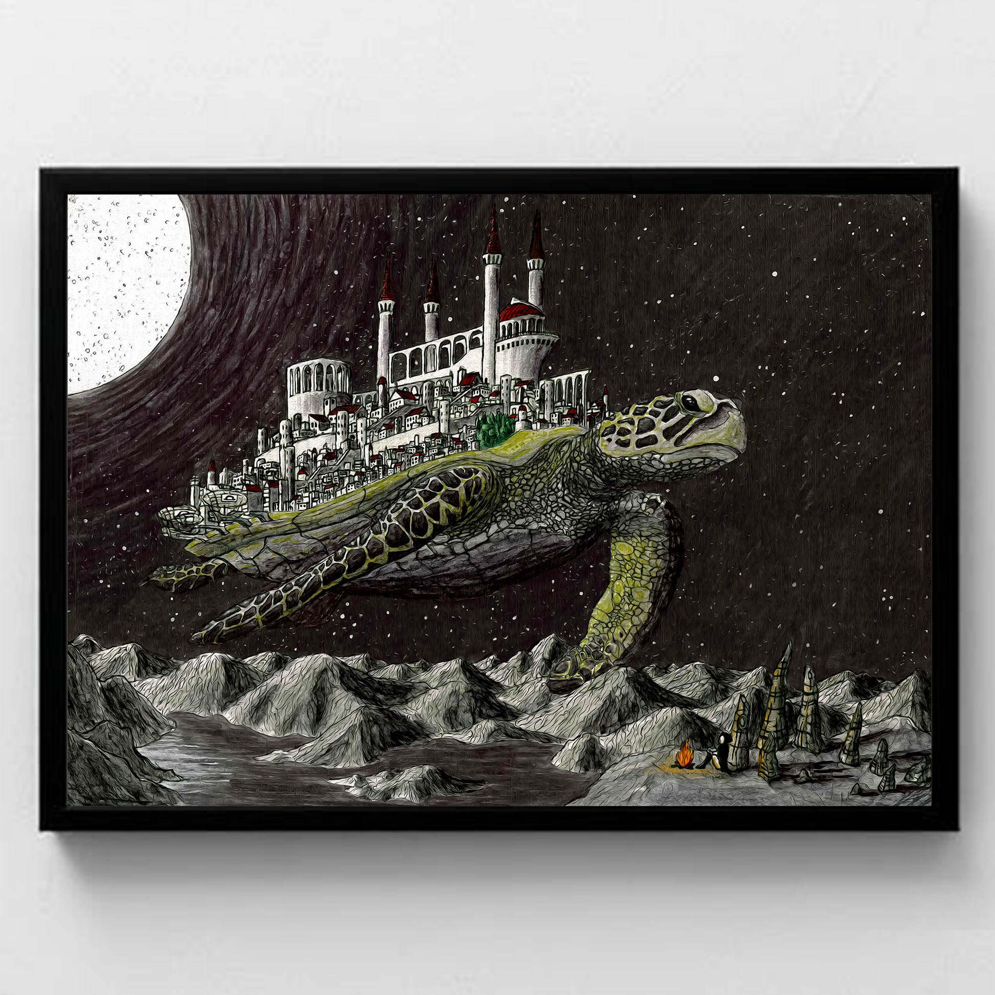 I have always been fascinated by the idea of turtles carrying entire cities on their backs. With this work, titled On The Shoulders Of Gentle Giants, I visualize exactly that: An ancient city, built on the back of a colossal turtle, traveling with serene determination through the infinity of our universe. Where does this epic journey lead? The answer can be found in the calm, yet resolute gaze of this impressive, gentle giant.